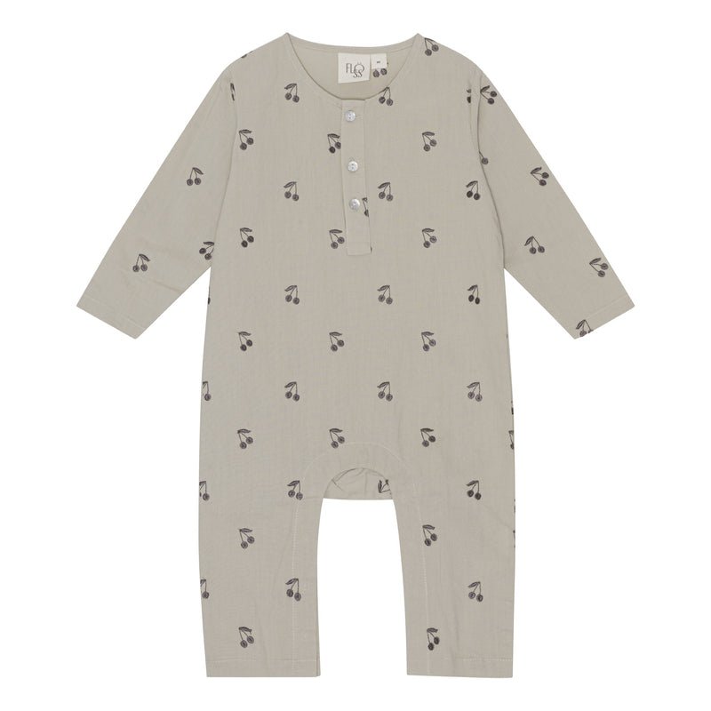 Bernie onesie in soft poplin is made from organic cotton with adorable cherries embroidery. Featuring regular sleeves, straight legs, a round neck, a half-front opening with mother-of-pearl buttons, and snap buttons around the inner legs for easy dressing.